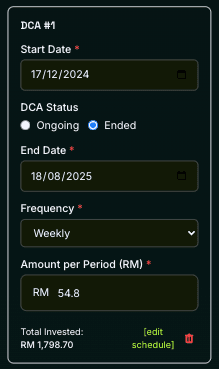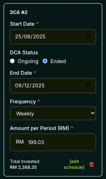 - DCA #2: Later in the year, I increased it to RM 199.03 every week.
