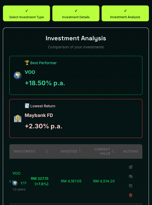 - The 18.5% p.a. (The Speed of the Asset): This is the Per Annum (yearly) return. It tells you how much the S&P 500 grew from January to December. Comparing this to a Maybank Fixed Deposit (2.30% p.a.) shows you how much harder your money is working when it is invested in VOO.