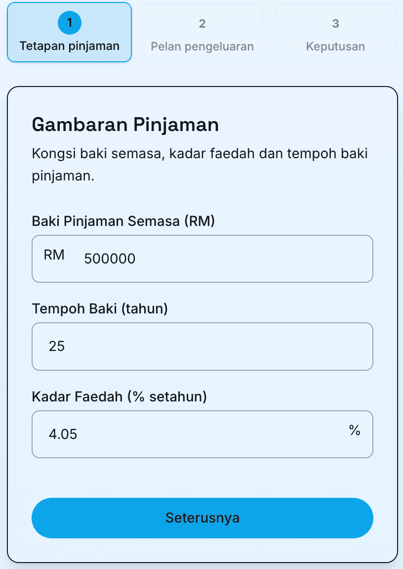 Untuk membandingkan pilihan dengan tepat, anda mesti terlebih dahulu menetapkan profil pinjaman anda. Input utama untuk kalkulator termasuk: