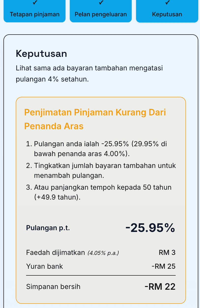Nota Penting: Sekiranya tiada sebarang yuran pengeluaran yang berkaitan dengan bayaran lebih pinjaman rumah, maka mendepositkan RM1,000 ke dalam pinjaman rumah akan menjadi pilihan kewangan yang lebih kukuh.